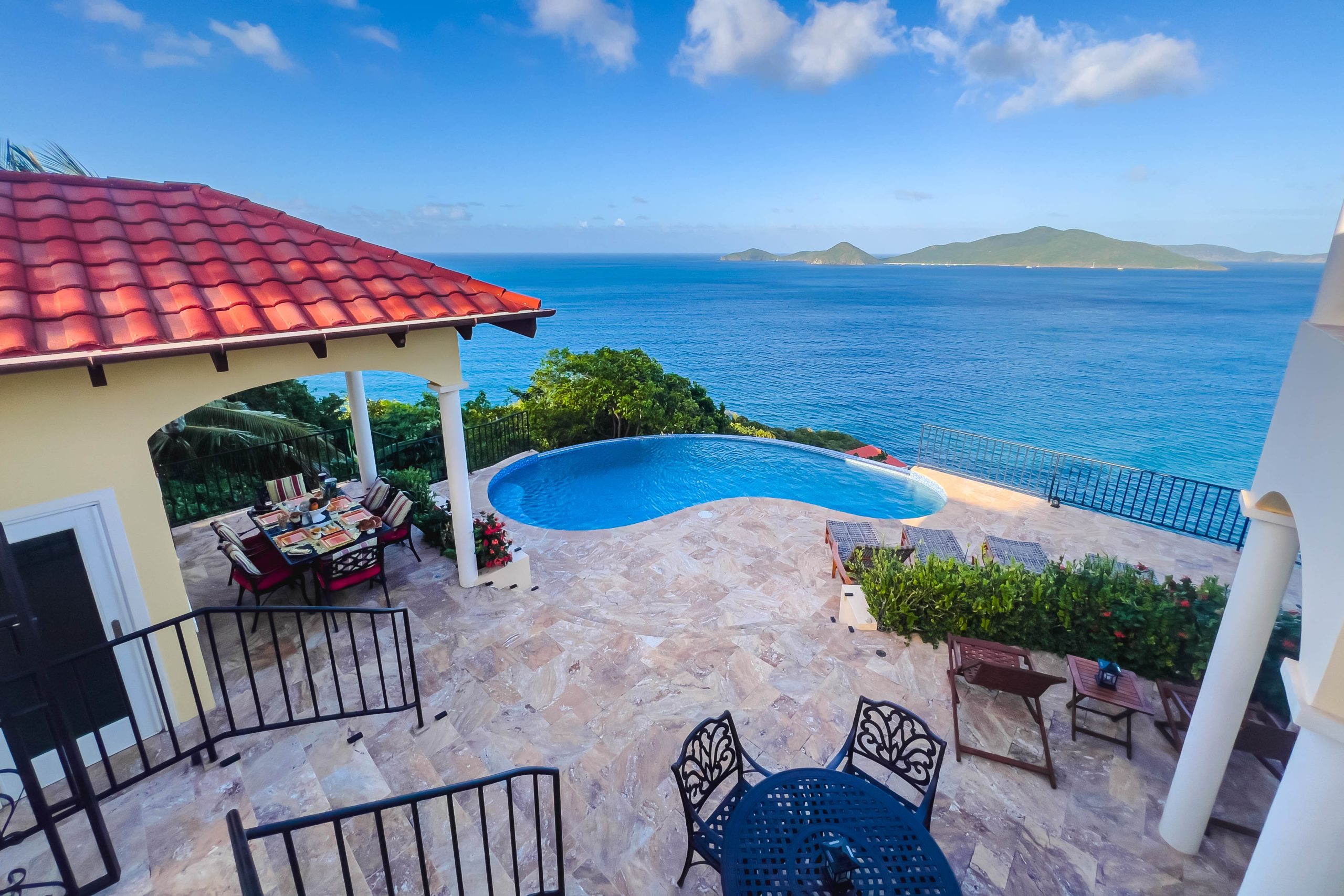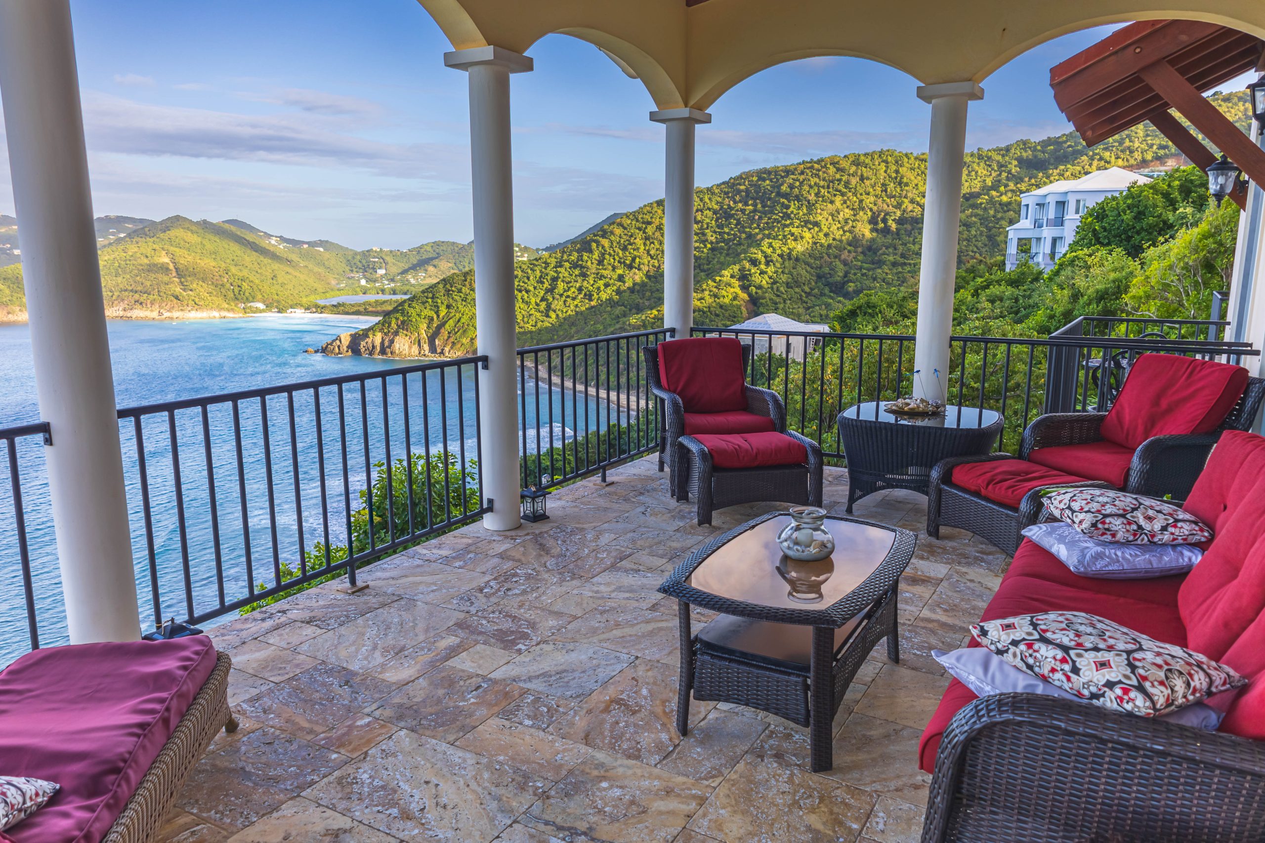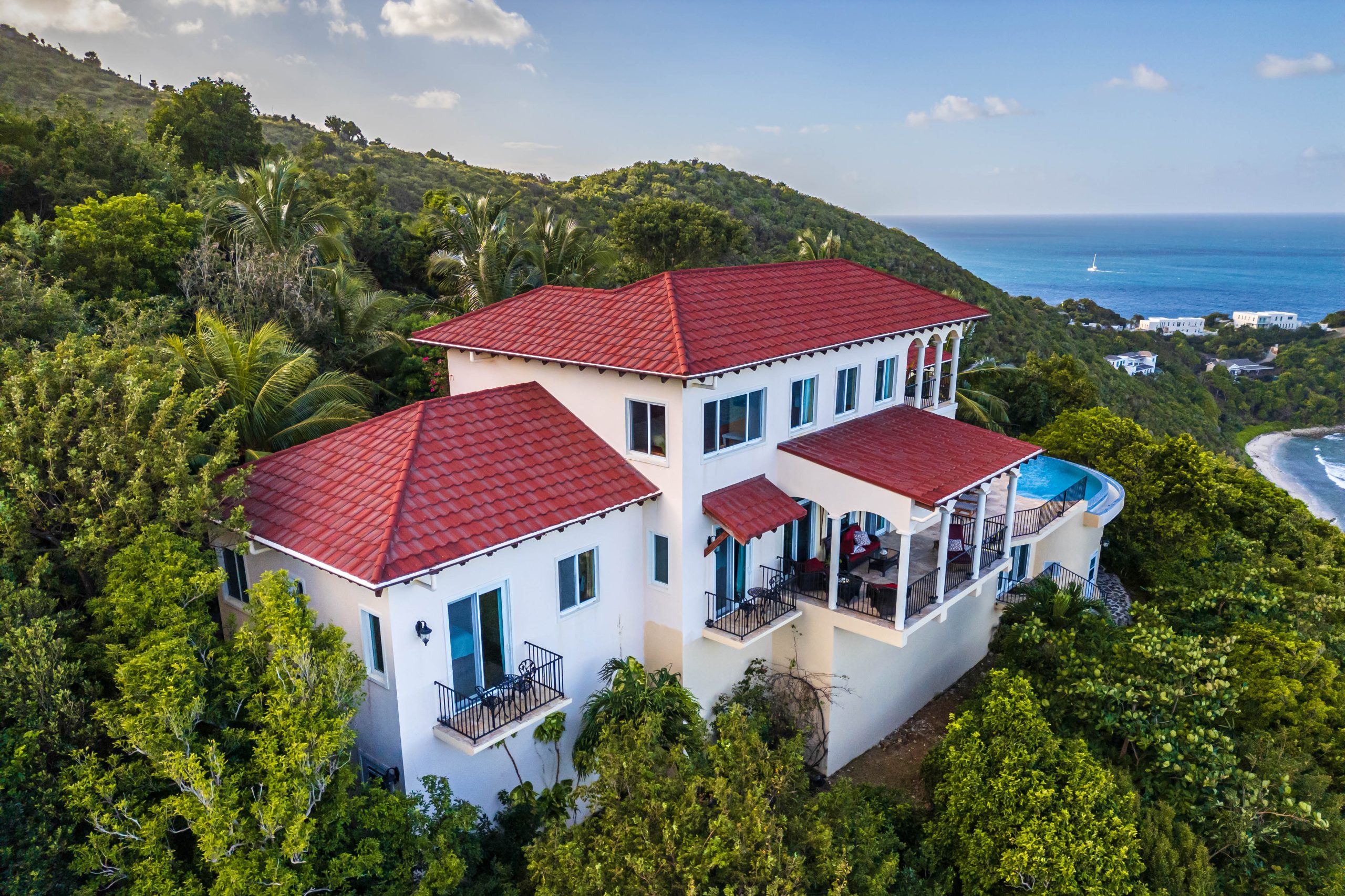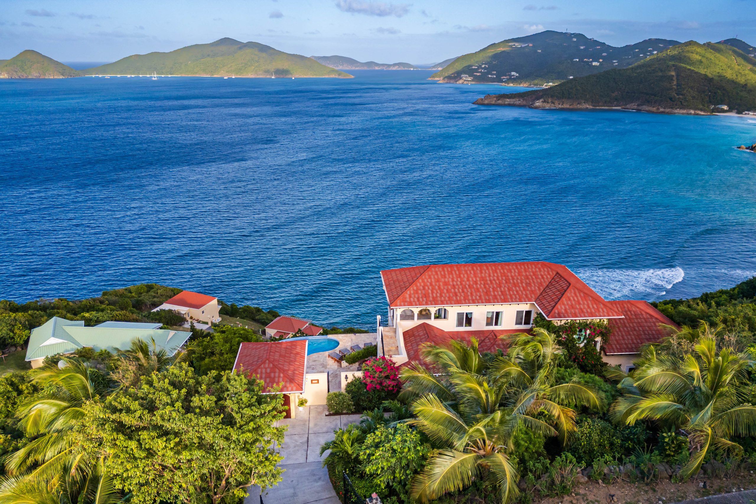 This 5,000 sq. ft. Italian‑inspired villa features panoramic views of Guana Island, Little Camanoe, the Dogs, and Necker Island. The estate blends old‑world charm with modern comforts including high‑speed Wi-Fi, home theatre, Sonos sound, and security cameras. Perched high above Cooten Bay, it enjoys constant breezes and peaceful natural surroundings.